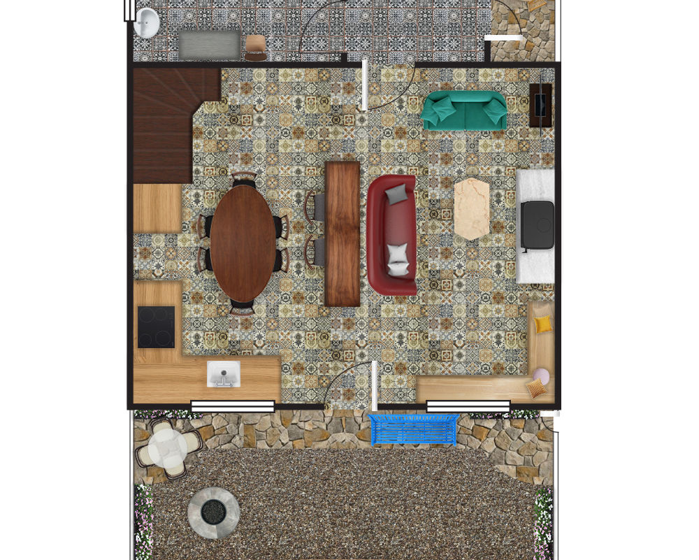 This is the heart of the farmhouse, where days naturally begin and often end. With its exposed stone walls, heavy wooden beams, and beautifully patterned floors, the kitchen and dining space feels full of life, stories, and shared moments. It’s a place made for slow breakfasts, long suppers, and conversations that drift from the table well into the evening. Thoughtfully equipped for cooking and gathering, with a mix of rustic charm and modern comforts, it’s a room where food is prepared with ease, glasses are filled, and everyone seems to naturally come together.