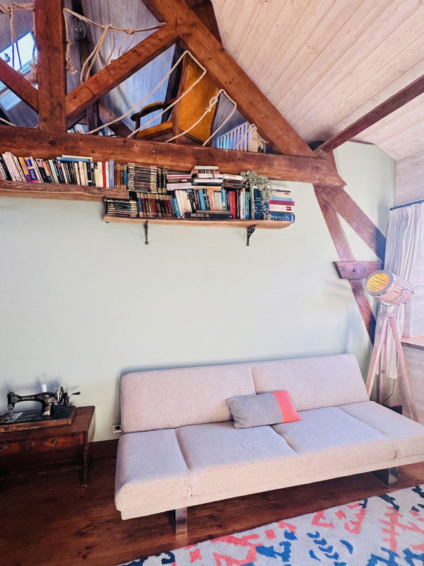 We use this second lounge as a quieter retreat, set aside for reading, working, or simply resting with a little more calm. With its sofa bed and gentle light, it’s a comforting space to pause, reflect, or enjoy a slower part of the day.